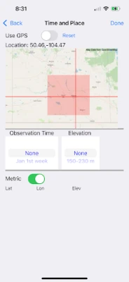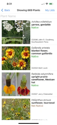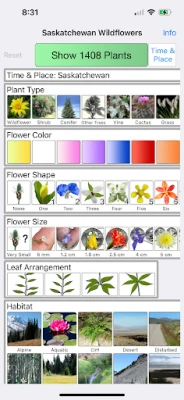 The App includes 1,355 species of plants found in Saskatchewan. Overall, 730 are "Wildflowers", 105 are shrubs, 42 are broadleaf trees, 11 are conifers, 8 are vines, 251 are grass-like, 39 are fern-like, 67 are moss-like and 145 are lichen.