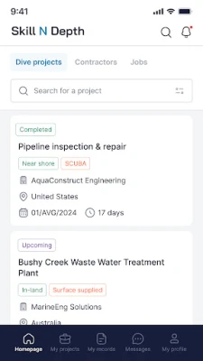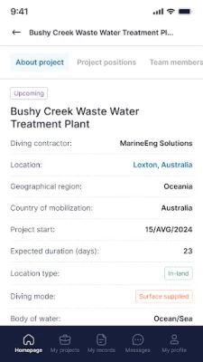 • Manage Projects: Contractors can create project records, assign teams, and keep all dive data organized and verifiable.
